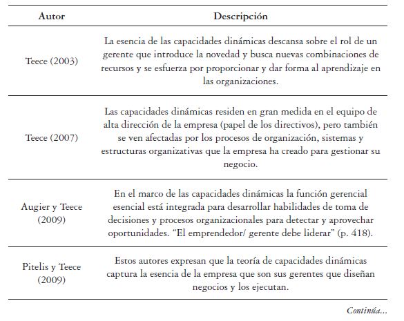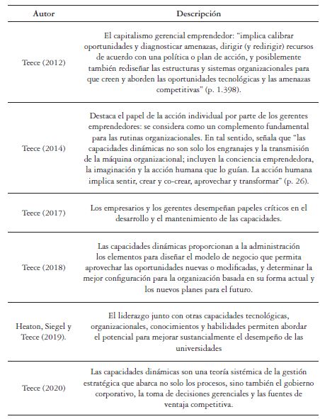 Las contribuciones de David Teece y sus colaboradores al desarrollo y ampliación de la teoría de capacidades dinámicas resaltan la importancia del liderazgo como un componente necesario para su desarrollo en las empresas. En la tabla 1 se presenta un resumen de estos aportes.
