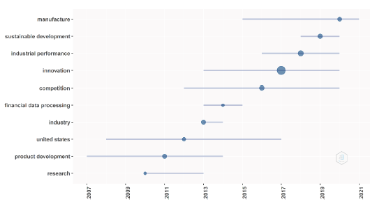 Una observación sobre las tendencias temática sobre los resultados en documentos publicados durante 2000-2021 evidencia que durante la primer década el estudio de procesos de innovación orientados al desarrollo de productos fue una tendencia temática predominante en investigaciones sobre innovación y desempeño financiero (Ver Figura 1), mientras que para la segunda década conceptos como el desarrollo sostenible y la competitividad son términos emergentes que constituyen las tendencias actuales sobre las que generalmente se orientan los procesos de investigación en las temáticas de estudio.