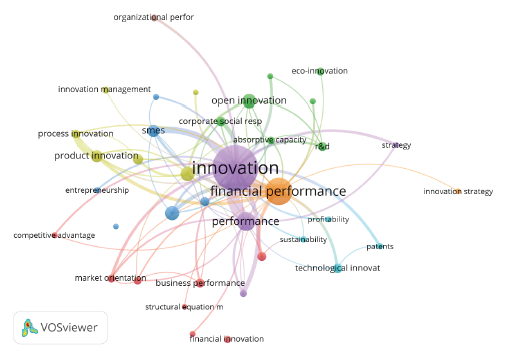 Los resultados sobre el mapa de coocurrencia en palabras clave de las publicaciones analizadas presenta como concepto de mayor centralidad/densidad la innovación que se encuentra interconectado con casi todos los nodos en el mapa, en segunda instancia el desempeño financiero se fracciona en tres clústeres conceptuales diferentes de menor densidad y centralidad: desempeño financiero, desempeño y desempeño de la firma (Ver Figura 2) cuyas conexiones son más limitadas con los nodos sobre la periferia del mapa.