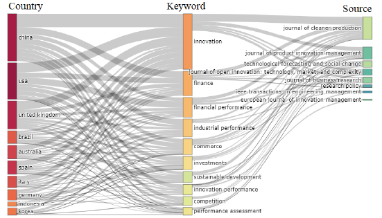 Los flujos sobre las categorías segmentadas permiten identificar que los países con mayor contribución en la investigación sobre los efectos de la innovación en el desempeño de las organizaciones son China, Estados Unidos y Reino Unido, en sumatoria; el flujo de los tres países constituye una porción considerable en cada una de las palabras clave sobre el volumen total de artículos estudiados (Ver Figura 3), los resultados del diagrama sobre las fuentes presentan el Journal of Cleaner Production como la fuente de mayor contribución en las temáticas estudiadas.
