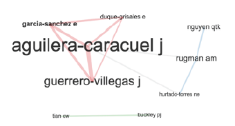 Se debe agregar que, para la visualización de la red de colaboración entre autores, la herramienta bibliometrix utiliza los registros obtenidos en la consulta de las bases de datos en los periodos 2000 al 2021. Cada nodo está representado por un autor, se seleccionan los 20 con más publicaciones y mínimo 2 conexiones (coautorías), este filtro arroja una red de 9 investigadores. El tamaño del nombre del autor representa la cantidad de publicaciones, y colaboración entre investigadores se ve reflejada por la línea que los conecta, en particular, el grosor implica un mayor número de trabajos como coautores.