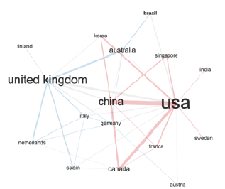 Así mismo, para facilitar la identificación de la colaboración entre países, bibliometrix utiliza los registros obtenidos, y representa cada país como un nodo, se seleccionan los 20 con mayor número de publicaciones y que cuenten con al menos 2 conexiones entre ellos. El resultado, sugiere una fuerte cooperación en varios grupos. El principal, integrado por Estados Unidos, China y Francia, lo que se refleja en una mayor autoría transnacional, lo llamativo de este grupo, es que está compuesto por países de 3 continentes, lo que implica una importante integración de escuelas y diversas corrientes académicas. Por otro lado, se identifica un segundo grupo conformado por Reino Unido, Finlandia, España, Italia y Holanda, lo que muestran la conexión entre las redes de pensamiento europeas.