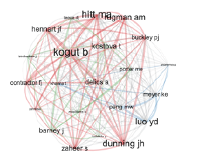 La figura 4, muestra la red de cocitaciones de autores, la cual, permite identificar a los investigadores que más se destacan al interior de la red, esto a partir del número de veces que es referenciado (White, 2003). Este es un criterio para determinar cuáles son los autores más influyentes del tema en específico (Small, 1973). Se seleccionaron los 20 autores más citados, en donde se destacan los 5 principales, Alan M. Rugman, Andrew Delios, Mattew A. Hitt, Kogut B y John Dunning; los dos primeros investigadores también hacen parte del listado de autores con mayor número de trabajos publicados en el área (table 3).