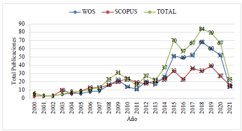En cuanto a la cobertura en Scopus es más amplia que en WoS, la superposición es un tema evidente (Aksnes & Sivertsen, 2019), aproximadamente un 70% de los registros localizados en una base de datos se encuentran en la otra (Bar-Ilan, 2010). Sin embargo, emplear las dos bases de datos permitirá realizar un comparativo del comportamiento de la producción científica en esta área del conocimiento, lo cual puede ser un aporte adicional de esta investigación.