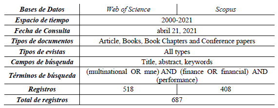 Con el fin de cubrir el vacío detectado y atender las cuestiones de investigación anteriores, se efectuó un análisis en detalle de tipo bibliométrico de los estudios relacionados con el desempeño financiero de las MNE, presentes en WoS y Scopus. Es por esto, que en este artículo se realizó un mapeo científico del desempeño financiero de las MNE, y de esta forma, ofrecer una visión holística del tema mediante la exploración de la evolución del campo. De ahí, que cumplir con este objetivo, se emplea el paquete Bibliometrix y la herramienta Gephi para analizar y visualizar las tendencias y comportamiento de la producción científica registrada en Web of Science y en Scopus.