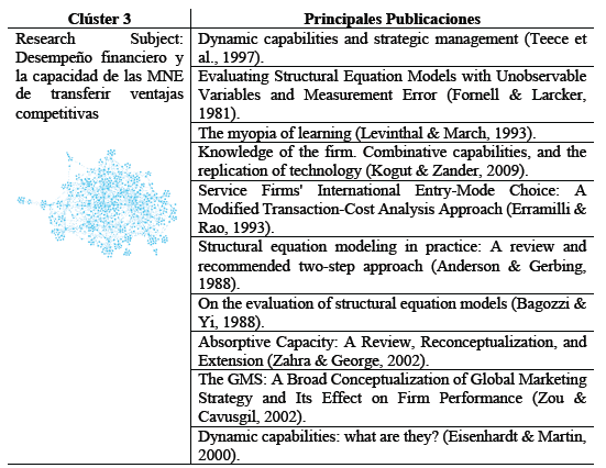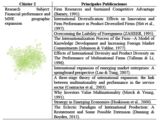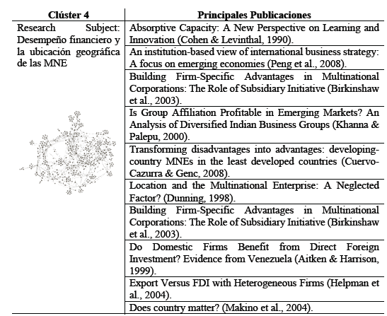 Finalmente, se identificaron las subáreas de investigación sobre el desempeño financiero de las MNE que surgen de la literatura. El estudio revela la conformación de cuatro principales corrientes: La relación del desempeño Financiero y las MNE que realizan prácticas de RSE, Expansión geográfica de las MNE, transferencia y uso de ventajas competitivas de las MNE y ubicación geográfica de la MNE. La explicación de cada uno de estos temas se relaciona en cada uno de los clúster analizados.