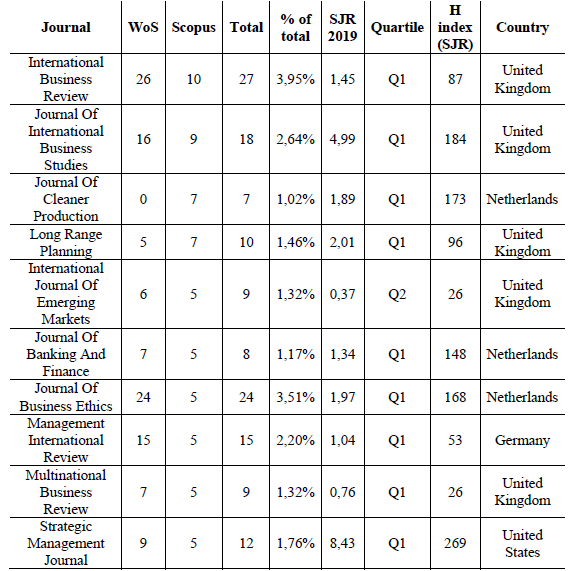 Por consiguiente, la tabla 2 muestra las 10 revistas que cuentan con mayor número de publicaciones en el tema. La revista de mayor producción es International Business Review, la cual cuenta con el 3,95% de los documentos, seguida de Journal Of International Business Studies con el 2,64%. Como se evidencia, no se podría hablar de la hegemonía de una sola revista, ya que ninguna cuenta con un volumen de registros considerable frente a las demás. Además, sumando el número de trabajos registrados en 10 revistas más importantes, han publicado el 20,35% del total de artículos. Un elemento que resulta importante, es el origen de las revistas, ya que 5 de las 10 son del Reino Unido, lo que demuestra el protagonismo de este país en lo que respecta al control de los centros editoriales. Las revistas restantes (Journal Of Cleaner Production, Journal Of Banking And Finance, Journal Of Business Ethics, Management International Review y Strategic Management Journal) son de Países Bajos, Alemania y Estados Unidos.