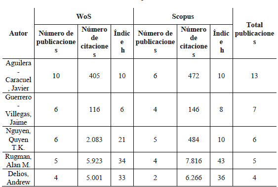 Es así como, la tabla 3, relaciona los 5 autores que han contribuido con más trabajos a esta área. Para completar este listado, se realiza un comparativo entre los registros encontrados en WoS y Scopus, además, se vinculan indicadores como número de citaciones e índice h (Indicador propuesto por Hirsch (2005) que permite medir la productividad científica de cada investigador). También, se relaciona las publicaciones totales de cada autor, este dato se obtiene al comparar los registros en cada base de datos y eliminar los duplicados.