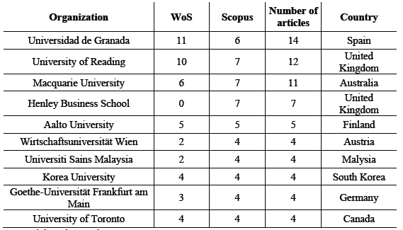 La tabla 4 presenta las 10 instituciones con el mayor número de publicaciones registradas en este estudio bibliométrico (69 de 683). La Universidad de Granada en España, es la institución que más aporta con en este campo de investigación con 14 documentos, seguida de University of Reading y Macquarie University con 12 y 11 documentos respectivamente.