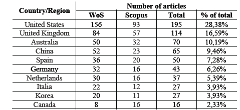 En la tabla 5 se asocian los 10 países/regiones con mayor número de publicaciones en el desempeño financiero de las MNE, desagregado por cada base de datos y en total (para obtener este dato se realizó la depuración de registros duplicados en Wos y Scopus). Estados Unidos aporta el 28,38% de todos los datos analizados, esto demuestra el liderazgo de este país en lo que respecta al número de trabajos frente a otros países. Los países que co-lideran el listado son Reino Unido (16,59%) y Australia (10,19%).