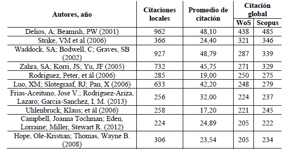 Más aun, un indicador que permite relacionar el impacto de los artículos, es el promedio de las citaciones, el cual se calcula dividiendo las citas locales entre el número de años transcurridos desde su publicación, en este caso Waddock et al. (2002) y Delios, A; Beamish, PW (2001a) cuentan con más de 48 citas por año, lo que los convierte en los de mayor influencia en la actualidad.