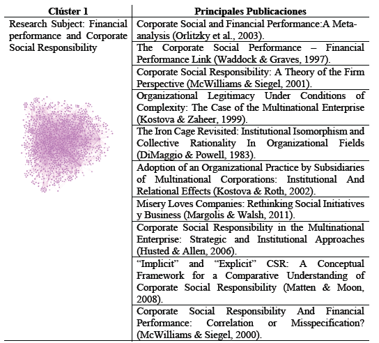 El primer clúster, presenta los impactos de las prácticas de RSE y el desempeño financiero de las Multinacionales (Husted & Alien, 2006; Margolis & Walsh, 2011; Matten & Moon, 2008; McWilliams & Siegel, 2000, 2001; Orlitzky et al., 2003; Waddock & Graves, 1997). Igualmente, en este clúster se complementan publicaciones relacionadas con el desempeño financiero de las MNE y la responsabilidad en el sostenimiento social y ambiental de los países en los que se encuentran instaladas sus subsidiarias (DiMaggio & Powell, 1983; Kostova & Roth, 2002; Kostova & Zaheer, 1999).