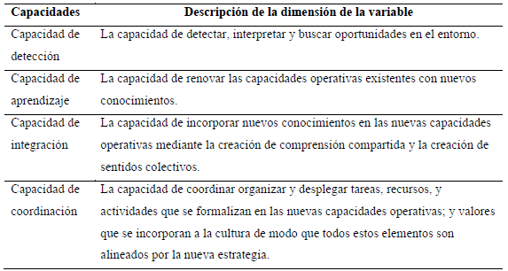 Dos taxonomías predominan en la literatura, la primera se origina en Teece et al. (1997), que definen cuatro capacidades dinámicas: capacidad de reconfiguración, capacidad de aprendizaje, capacidad de integración y capacidad de coordinación. Sin embargo, en Teece (2007) se reducen a tres: capacidad de detección (sensing) para aprovechar las oportunidades del entorno; capacidad de captura o aprovechamiento (seizing); y capacidad de reconfiguración (transforming) de los activos tangibles e intangibles (Pavlou & El Sawy, 2011). El dimensionamiento en este artículo se apega a la taxonomía reagrupada por Pavlou y El Sawy (2011), que establece las siguientes cuatro capacidades dinámicas y engloba la clasificación de Teece (1997, 2007): (1) capacidad de monitoreo (o detección); (2) capacidad de aprendizaje; (3) capacidad de integración; y (4) capacidad de coordinación. En la Tabla 1 se presenta el concepto de cada capacidad.