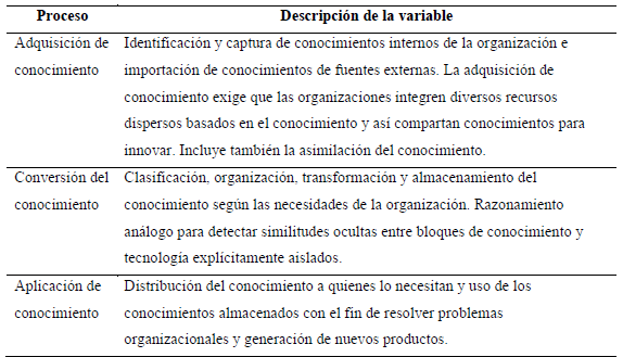 Bock y Kim (2002) sostienen que el conocimiento es el poder que ayuda a resolver problemas organizacionales. Gestionar el conocimiento de manera eficiente y efectiva apoya el proceso de toma de decisiones y ayuda las organizaciones a obtener una ventaja competitiva sostenida (Khasawneh & Abu-Shanab, 2013). Las organizaciones actuales tienen grandes preocupaciones acerca de la creación y gestión del conocimiento para mejorar su desempeño empresarial. Teece (2000) enfatiza que un mayor desempeño depende de la capacidad de la organización para hacer frente a la innovación, lo que se deriva de proteger y utilizar los activos de conocimiento intangibles de manera que generen beneficios. Una de las funciones más importantes de la gestión del conocimiento es fomentar el intercambio de estos recursos, lo que es fundamental para mejorar los resultados de innovación y, en efecto, producir ventajas competitivas sostenibles. Particularmente, existe una relación importante entre la gestión del conocimiento y las capacidades dinámicas, pues éstas últimas a partir de la primera tienen la habilidad de replicar y reconfigurar los recursos organizacionales (incluyendo competencias) a través de procesos gerenciales. Las capacidades dinámicas a través de la replicación y reconfiguración del conocimiento se producen si el conocimiento organizacional puede: identificarse y externalizarse mediante la codificación del conocimiento; puede ponerse a disposición de toda la organización sin una difusión involuntaria a los competidores; puede transferirse a campos nuevos del conocimiento; y se puede combinar con nuevo conocimiento externo de la organización mediante la absorción de conocimiento (Burmann, 2002). Adicionalmente, Zahra y George (2002), como se referenció previamente, aclaran que el concepto de absorción del conocimiento se divide en la "capacidad potencial" de la firma para adquirir y asimilar conocimientos; y la "capacidad de realización" de la firma, es decir, la capacidad para crear y aplicar el conocimiento a la empresa. Con base en lo anterior, en la Tabla 2, según lo que se ha planteado, se establecen tres procesos claves que comprenden la gestión del conocimiento.