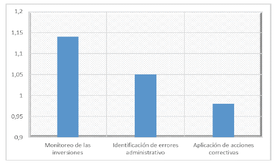 En la tabla 2, se observan los resultados hallados con respecto a la comparación surgida entre los indicadores pertenecientes a la dimensión procedimiento de evaluación de riesgo financiero, en la que la prueba de múltiples rangos de Tukeya, se ubica en un subconjunto fundamentado en la similitud y diferencias originadas en las medias, ordenados según la homocedasticidad arrojada en la tabulación estadística, denotándose que en primer orden se encuentra el monitoreo de las inversiones con el puntaje superior de una x̅ de 1,14, posteriormente identificación de errores administrativos con una x̅ de 1,05 y finalmente la aplicación de acciones correctivas con x̅ de 0,98.