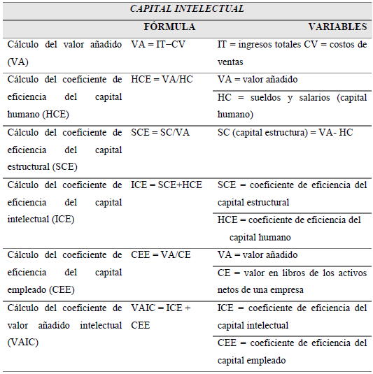 Para el cálculo del VAIC se sigue una metodología que consiste primero en calcular el Valor Añadido (VA), posterior a ello el coeficiente de eficiencia del capital humano (HCE), el coeficiente de eficiencia del capital estructural (SCE), coeficiente de eficiencia del capital intelectual (ICE), coeficiente de eficiencia del capital empleado (CEE), por último, a través de estos se llega al VAIC. Los distintos pasos de la metodología propuesta se resumen en la tabla 1.