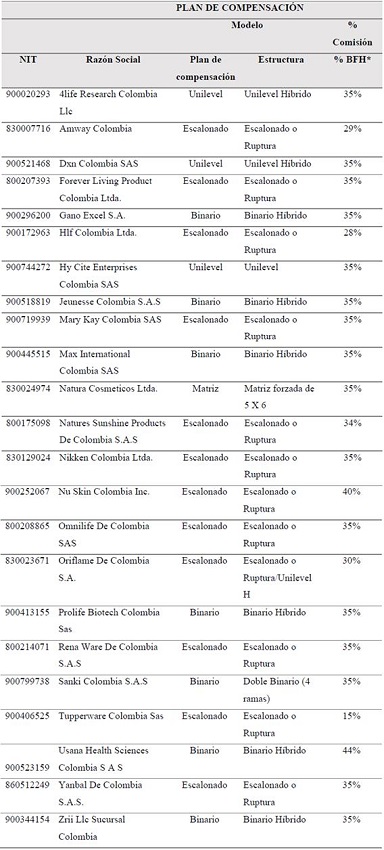 Se filtraron por medio los criterios de inclusión 30 empresas, de estas MLM identificadas el 87% pertenece al The World Federation of Direct Selling Associations, (WFDSA) (federación mundial de asociaciones de venta directa) y 50% pertenecen a la Asociación Colombiana de Venta Directa (ACOVEDI) una entidad sin ánimo de lucro que agrupa a las principales empresas de venta directa del sector en Colombia. Según la clasificación y acreditación de Better Bussines Bureau (BBB), de estas empresas el 33% tiene calificación A+, 57% tiene calificación AA+ y 7% AAA+.