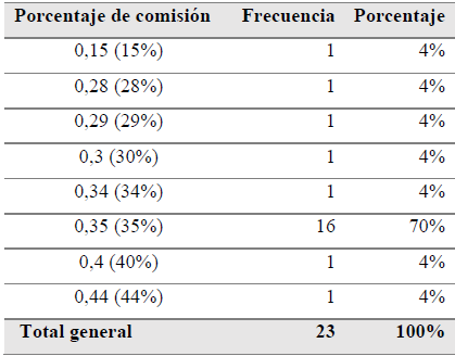 Resulta relevante el porcentaje de comisión porque se tomó en cuenta para calcular el valor del capital humano para las 23 empresas analizadas, dado que en sus informes financieros no aparece esta cuenta, y a los asociados se les retribuye por comisión y no por salarios. Respecto al porcentaje de comisión (BFH), este oscila entre un mínimo de 15% (Tupperware Colombia S.A.S) y máximo de 44% (Usana Health Sciences Colombia S.A.S). En la tabla 3 se presenta la distribución según el porcentaje de comisión, el 70% de las empresas ofrece a sus vendedores independientes un 35% de comisión, siendo este el valor más relevante y con mayor participación.
