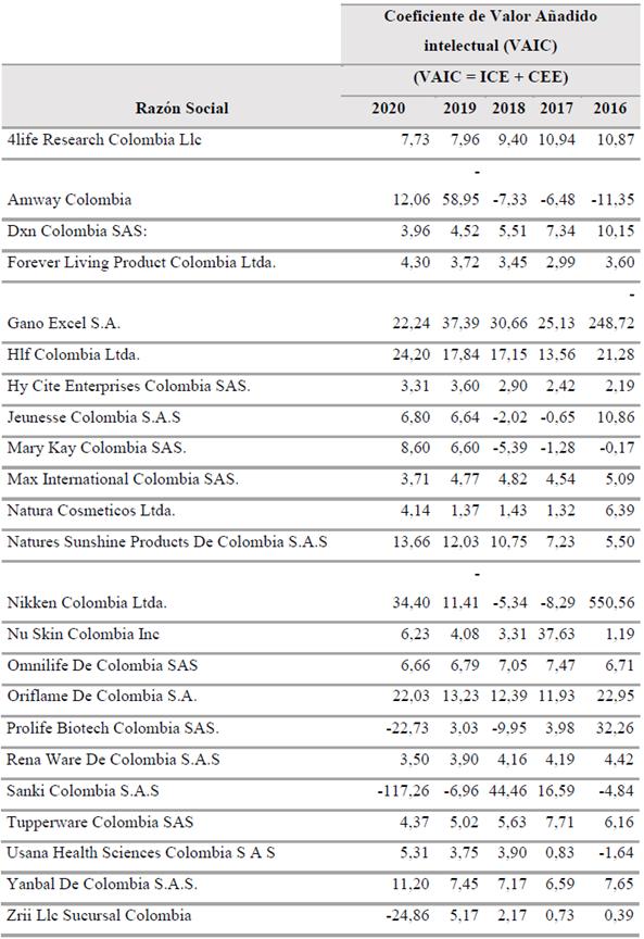 El VAIC se calcula con la formula VAIC = ICE + CEE (donde: ICE = coeficiente de eficiencia del capital intelectual y CEE = coeficiente de eficiencia del capital empleado). En la tabla 5 se presenta el valor del VAIC para empresas para los años de 2016 a 2020. Se destaca que empresas como Amway Colombia, Nikken Colombia Ltda., Prolife Biotech Colombia SAS., Sanki Colombia S.A.S y Zrii Llc Sucursal Colombia, presentan resultados negativos en más de un año, en el caso de Gano Excel S.A., el resultado negativo solo fue para el año 2016, para los años siguientes se invirtió esta situación (Ver tabla 6).