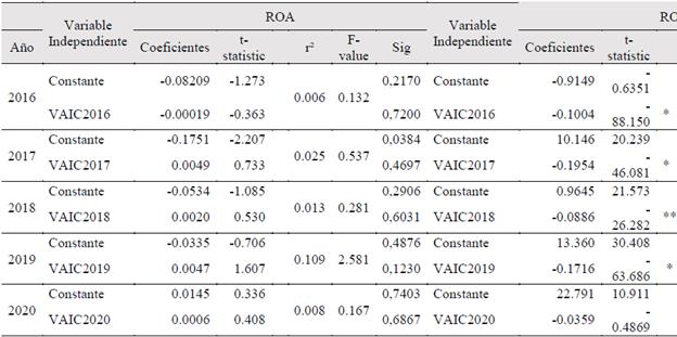 En la tabla 7 se presenta el análisis de la relación entre las distintas variables: VAIC, ROA y ROE. En este caso el VAIC se toma como variable independiente, y como variables dependientes el ROA y ROE. Se calculó diferentes coeficientes, como el t-statistc, r2 y F-value, para los años: 2016, 2017, 2018, 2019 y 2020. Como se observa existe una correlación positiva entre el VAIC y ROA, que para el año 2020 fue de 0.008, para 2019 de 0.109 para 2018 de 0.013, para 2017 de 0.025, lo que demuestra que, si existe una correlación, pero según estos valores dicha relación varía a través de los años, lo que se explica por las variaciones que se presentan en el comportamiento de la utilidad neta del ejercicio de las 23 empresas evaluadas que se ven alterada por pérdidas recurrentes en más de un periodo, lo que no debería ser una situación habitual.