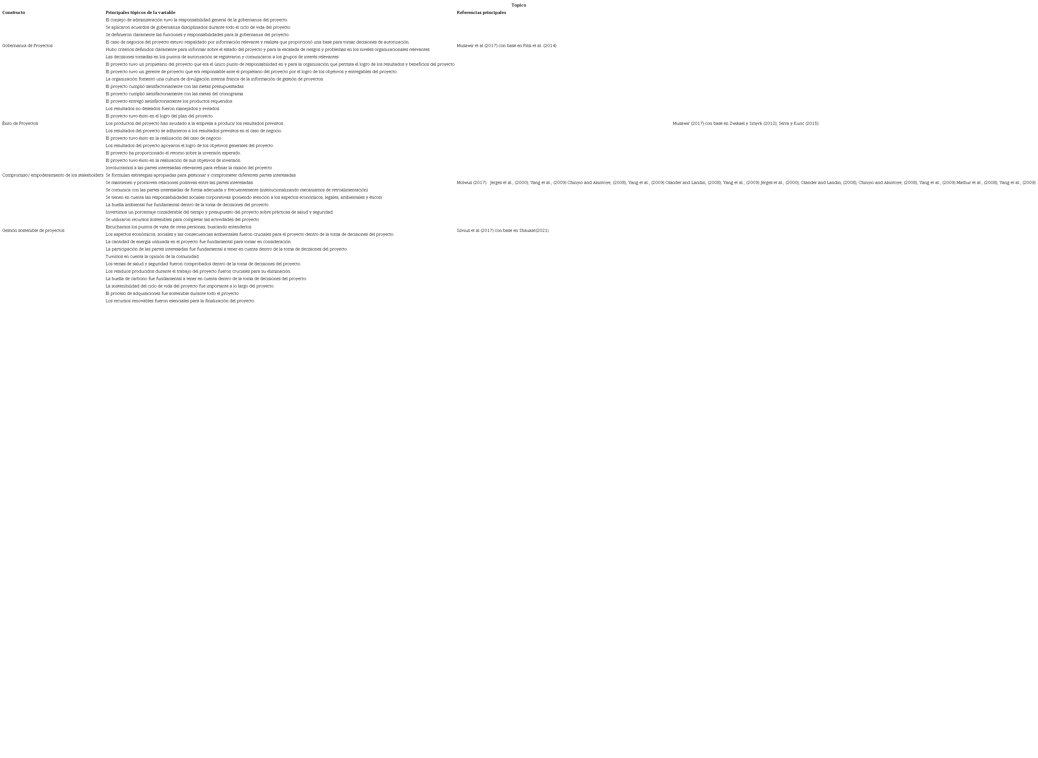 El instrumento está compuesto por cuatro constructos, la escala final de gobernanza de proyectos construida por Musawir, et al., (2017) con base en Pitsi et al. (2014) contiene 9 items, la escala de éxito del proyecto consta de 11 ítems construidos por Musawir, et al., (2017) con base en el marco de desempeño de prueba triple desarrollado por (Zwikael & Smyrk, 2012), así como los ítems desarrollados por Serra y Kunc (2015). La escala consta de tres dimensiones: éxito en la gestión del proyecto (5 elementos), éxito en la propiedad del proyecto (3 elementos) y éxito en la inversión del proyecto (3 elementos). La escala de compromiso de los stakeholders construida por Molwus et al., (2017) con base en múltiples autores contiene 5 items y el de gestión sostenible de proyectos con 14 items, fue adaptado de Silvius, (2017). Estos elementos fueron seleccionados porque reflejan la literatura relevante que vincula los aspectos de sostenibilidad con la gestión de proyectos.