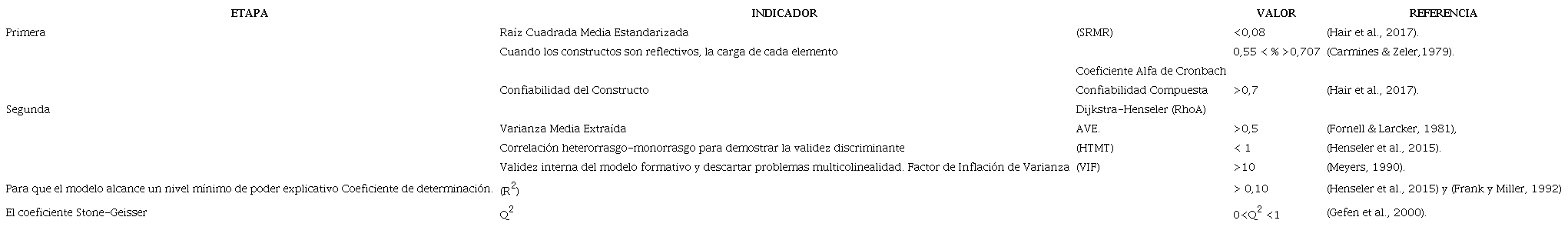 A partir del modelo elegido, se estimó el modelo estructural a través de mínimos cuadrados parciales (PLS), utilizando la aplicación SmartPLS 4. El modelo de ecuaciones estructurales (SEM) utilizan la varianza total de los conceptos o constructos basado en la covarianza (Jöreskog 1978), por el tipo de investigación y además por los datos recolectados (J. Hair et al., 2016). Se adoptaron las escalas de medida de acuerdo con investigaciones previas, como se explicó anteriormente, estas escalas son de tipo Likert. La utilización PLS es recomendable para el estudio de constructos de segundo orden y análisis de la invarianza de medición y análisis multigrupo (Chin 1998; Hair et al. 2017). Por estos motivos, se consideró importante utilizar este método para el análisis de los datos. La utilización de PLS se realiza siguiendo tres etapas, las que se explican en la Tabla 2.