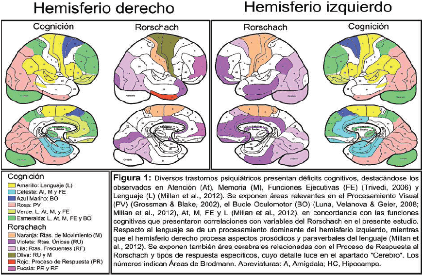 En los últimos años se ha podido observar un espectacular avance en la investigación de las relaciones entre cerebro, personalidad, psicopatología y funciones cognitivas (Wood et al., 2009). Es en ese marco que se interpretan los resultados obtenidos de la presente investigación. Acklin y Wu-Holt (1996) consideran el Rorschach como un test que implica un complejo proceso cognitivo, en el que participan amplios circuitos de ambos hemisferios, incluyendo aspectos de atención, percepción, gnosias, memoria asociativa, lenguaje y función ejecutiva. Ejima et al. (2007), sugieren que la generación de significados a partir de estímulos ambiguos implica la interacción entre memoria y percepción, y que regiones anteriores del hemisferio derecho resultan fundamentales en dicho proceso. Belyi (1988) señala la presencia de un sistema jerárquico en el hemisferio derecho respecto a la percepción visual, en donde las áreas frontales realizan procesos cada vez más complejos y de orden superior. Alteraciones en los niveles superiores preservan la percepción de detalles y pueden dar lugar a fenómenos fabulatorios. En efecto, en el proceso de respuesta al test participan “zonas amplias” de ambos hemisferios (Ejima et al., 2007; Wood et al., 2009), áreas relevantes en lo que respecta a lo que el test pretende evaluar: personalidad y psicopatología, así como en áreas relacionadas al procesamiento visual (Belyi, 1988). En lo que respecta al procesamiento visual la actividad de la corteza occipital es largamente documentada, así como la participación de áreas fundamentalmente de la derecha relacionadas con el procesamiento visoespacial más complejo (Lezak, 2004). El hemisferio derecho es también relevante en lo que respecta al procesamiento emocional en general y en lo que respecta a afectividad negativa en particular (Killgore & Yurgelun-Todd, 2007).