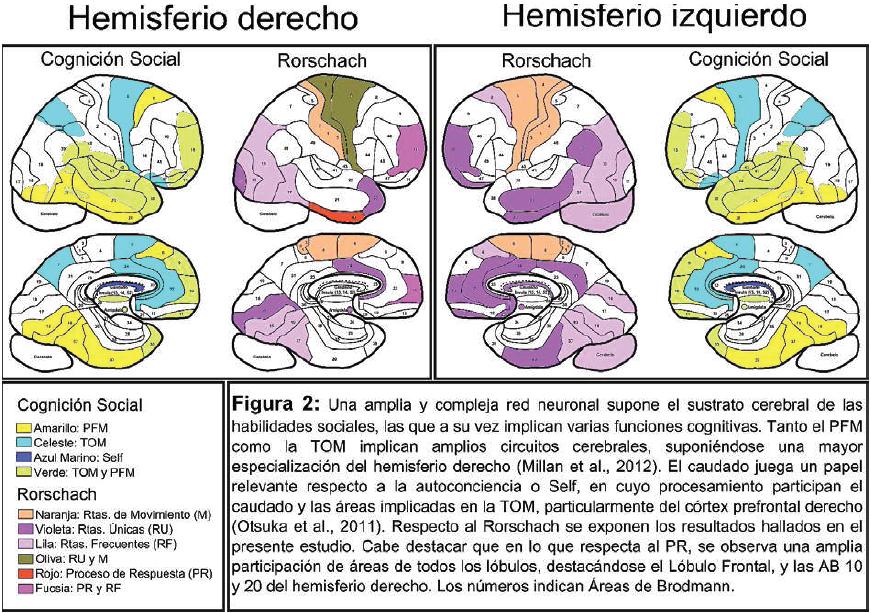 Áreas cerebrales relevantes en el proceso de respuesta al Rorschach: Áreas amplias de ambos hemisferios (Ejima, Takahashi, Yamamoto, & Goda, 2007) y el cuerpo calloso (Brown & Paul, 2000; Lewis, 1979). Destacan áreas visuales, la corteza prefrontal (Ejima et al., 2007) y las AB 10 (Hiraishi et al., 2012) y 20 (Ejima et al., 2007) derechas.