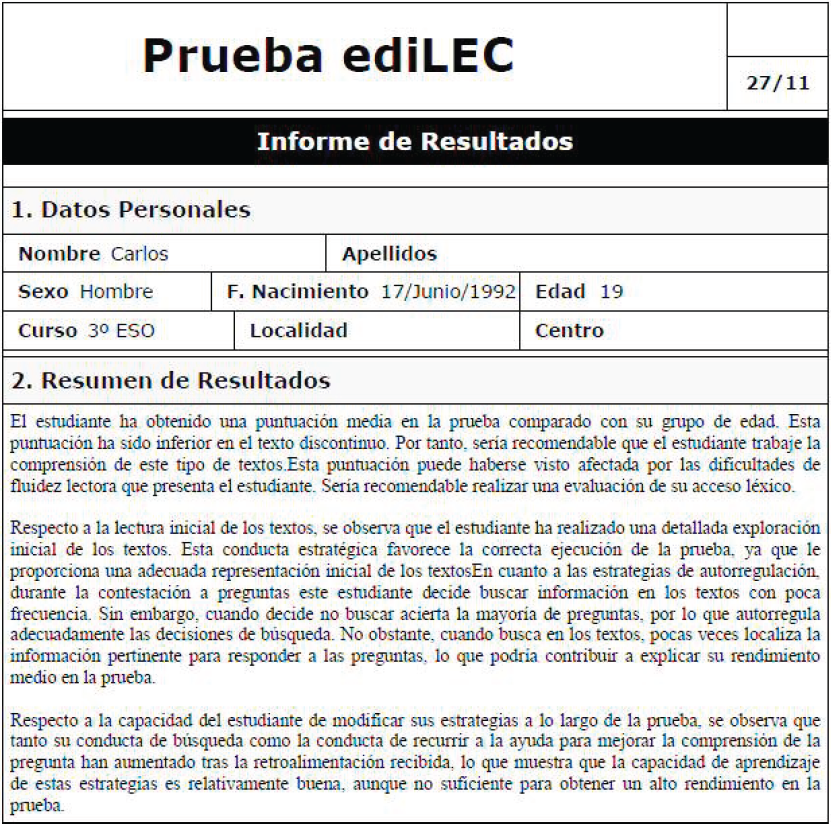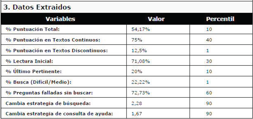 EdiLEC genera un informe individualizado (véase el Anexo 1), dividido en tres apartados: 1) datos personales; 2) resumen de resultados; 3) datos extra ídos. El resumen de resultados informa sobre el nivel de ejecución alcanzado por el alumno en la prueba, las estrategias empleadas y su potencialidad de aprendizaje. También, aporta consejos sobre cómo trabajar algunos procesos deficitarios. En los datos extraídos se muestran los valores de los índices relativos a las distintas variables de ejecución y proceso (decisiones tomadas por el alumno durante la lectura y resolución de preguntas); variables de aprendizaje registradas por el sistema y los baremos correspondientes. En la Tabla 2 se presenta una descripción de todas ellas.