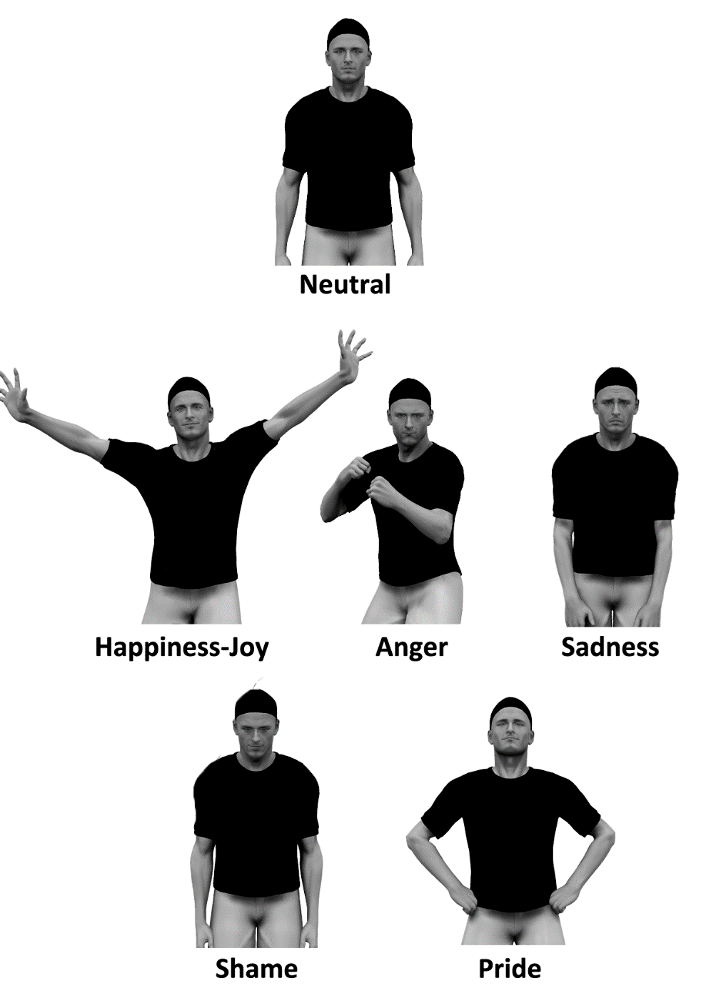 Since there are no intensity codes proposed in the BAP, three levels of intensity were obtained by morphing between an invariable neutral posture and the final postural configuration for each emotion (maximum intensity) at three equal (33 %) steps. While a reasonably neutral baseline is available for facial expressions (the resting geometry of the character’s head, with no activated AUs), a neutral body posture is a harder notion to define (Huis in ‘t Veld, Van Boxtel, & De Gelder, 2014). The choice, consistent with the BAP coding, was to use the “standard anatomic position” (back straight, feet slightly separated, head facing forward, arms at the side slightly out from the body) as a neutral baseline. All instances of full-body neutral expressions illustrated in the UCDSEE (Tracy et al., 2009) are actually pretty close to this standard posture.
