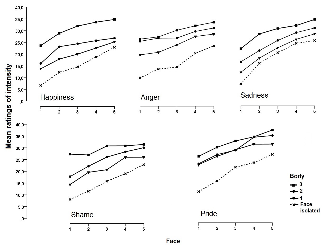 Cognitive algebra.Figure 2 presents the 5 (face) × 3 (body) factorial plots for the valence judgment tasks. Mean ratings of valence for the face subdesign are represented by the dashed line. Higher values on the ordinate correspond to more positive judgments, lower values to more negative ones. Despite being separately presented for each emotion, it should be recalled that data were collected from three tasks, each including two opposite-valence emotions (happiness-anger, happiness-sadness, shame-pride). Regardless of the task, combined face and body expressions in each trial were always valence-congruent (i.e., valence was only varied across, not within trials). Since happiness appeared in two tasks, a mixed ANOVA with face and body as within-subject factors and task as a between-subjects factor was initially performed. No significant effects of the task were found, either main, F(1,45) = 0.014, p = 0.905, or interactions (lowest associated p value = 0.07, for the second order interaction Task × Body × Face). Data collected for happiness in the two tasks were thus treated aggregately.