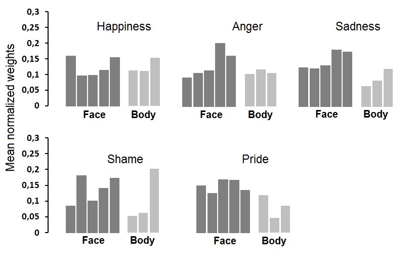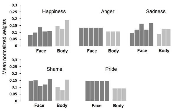 Estimated weights for the levels of face (1 to 5, from left to right) and body (1 to 3, left to right) in each emotion. Weights were estimated and normalized per participant. Values on the ordinate correspond to the mean of normalized weights, aggregated across participants.