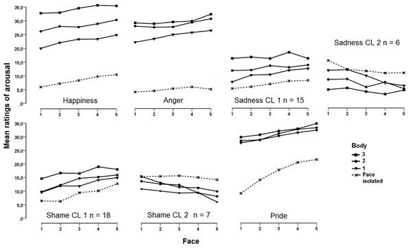 Statistical analyses concurred with the visual inspection. Results of repeated measures ANOVAs are reported in Table 2. In all cases, face and body had significant main effects. No significant interactions were found for anger and pride, agreeing with parallelism in the plots. These results support the linearity of the response scale and thus the psychological validity of the observed patterns. Despite apparent parallelism, a significant interaction was found for happiness in CL 1. This interaction rested on two higher-order components (cubic × quadratic and order 4 × quadratic) and, thus, did not involve differences in the overall slopes of lines. Confirming the observed downward convergence of lines, a significant interaction was found for shame, concentrated on the linear × linear component, F(1, 25) = 7.67, p = 0.01. The Face × Body interaction did not reach significance in sadness, but a significant bilinear component was present, F(1,21) = 6.30, p = 0.02. Finally, happiness in CL 2 presented a significant interaction, which, differently from CL 1, included a significant bilinear component, F(1, 12) = 7.29, p = 0.019.