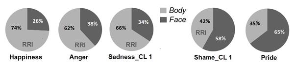 Source: own workEven if not presented, the RRI and its percentage translation were also calculated for the seven participants in Shame_Cl 2, providing values of relative importance similar to those of Shame_CL 1 (39 % for body and 61 % for face). Since the integration operation in CL 2 is subtractive, this suggests that the greater relative importance of face in the self-conscious emotions is not specific to participants adopting an additive view (and thus potentially mistaking arousal for intensity).