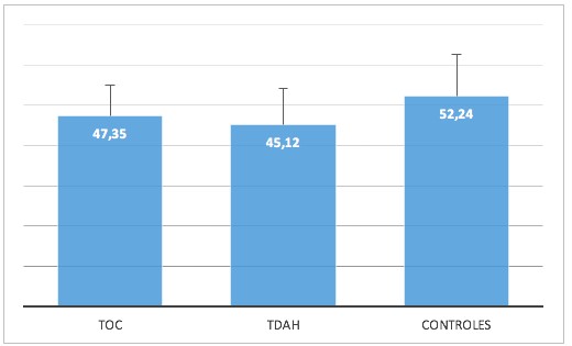Al comparar los resultados en el desempeño del Stroop interferencia a través de puntuaciones T (media = 50; DT = 10) se encuentra, que en promedio el mejor desempeño lo obtienen los participantes control, mientras que el rendimiento menor lo obtienen los sujetos con TDAH y muy cerca de estos los participantes con TOC siendo a su vez el grupo más homogéneo (DT TOC = 7.61, TDAH = 8.92 y controles =10.38), como se observa en la figura 1.