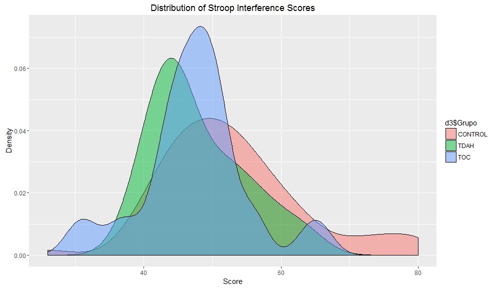 Se establecieron grupos de comparación de acuerdo al diagnóstico determinado a los sujetos participantes TDAH, TOC y controles. De cada grupo se tomaron las variables edad, sexo y puntuaciones T para stroop interferencia (PTSi). A la variable PTSi se le realizaron pruebas de normalidad y homocedasticidad para determinar el tipo de análisis estadístico a seguir. Para las pruebas de normalidad se tomó como única entrada todos los valores PTSi de TOC, TDAH y controles. Para ello se emplearon los estadísticos de Kolmogorov-Smirnov, Lilliefors y Shapiro-Wilk. Por otra parte, para la prueba de homocedasticidad se utilizó el estadístico de Barlett y se hizo discriminación de los valores PTSi por grupo de comparación TOC, TDAH y control. Los estadísticos de Kolmogorov-Smirnov, Lilliefors y Shapiro-Wilk arrojaron p-valores de 0.07, 3.37x10-4, 3.80x10-4 respectivamente. Acorde al valor p de dos de tres estadísticos empleados, se rechaza la hipótesis de normalidad en el conjunto de datos de PTSi. Por su parte la prueba de homocedasticidad con el estadístico de Barlett obtuvo un valor p de 0.15 el cual acepta el comportamiento de homocedasticidad entre las varianzas de cada uno de los grupos TOC, TDAH y controles.