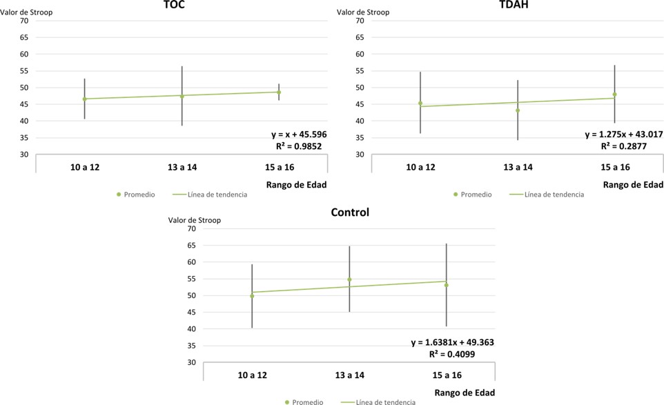 Los resultados de la prueba de regresión, indican que se encuentra relación entre la edad y el rendimiento en la tarea de inhibición de interferencia del Stroop para el grupo TOC (R2 = 0.98), con una correlación positiva, donde el coeficiente de determinación indica que cerca del 98 % del incremento en el rendimiento en la tarea evaluada, se puede relacionar con la edad.