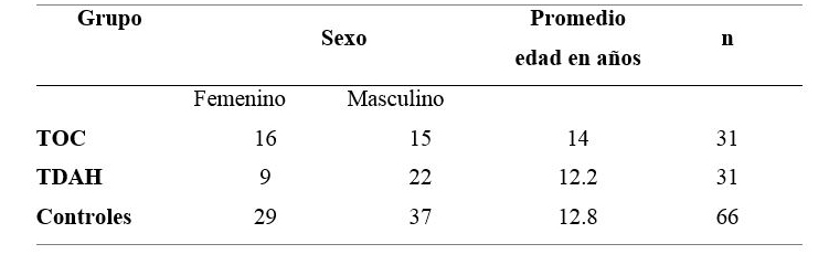 A partir de muestreo intencional se seleccionó una población de 31 casos con TOC, 31 con TDAH, que asistían a servicios de psiquiatría infantil y/o neuropsicología y 66 controles sanos, entre 10 y 19 años de edad. Los casos se seleccionaron teniendo en cuenta los siguientes criterios de inclusión: Los pacientes recibieron diagnóstico de TOC o TDAH a partir de los criterios de clasificación del DSM IV-TR (American Psychiatric Association, 2000) y por consenso de especialistas. Para el grupo de 66 controles, se identificaron niños sanos de instituciones educativas públicas y privadas, que mostraron rendimientos promedios y puntuaron negativo en las escalas clínicas. No tenían reporte de trastornos de comportamiento o aprendizaje en historia clínica, además de compartir características de edad, escolaridad y origen sociocultural con los grupos clínicos. Todos los participantes tanto casos como controles eran de nacionalidad colombiana, sabían leer, obtuvieron un puntaje de Cociente intelectual mayor a 70 en la Escala Wechsler de Inteligencia correspondiente a la edad (Wechsler, 2007; 2002) y aceptaron participar en el estudio a través de consentimiento y asentimiento informado. Los criterios de exclusión fueron: Ninguno de los individuos estudiados presentaban comorbilidad de otros trastornos del aprendizaje o del comportamiento, así como condiciones neurológicas que afectaran el desarrollo (Autismo, trauma craneoencefálico, epilepsia, desórdenes neurológicos, o genéticos, consumo de sustancias psicoactivas).