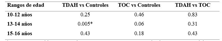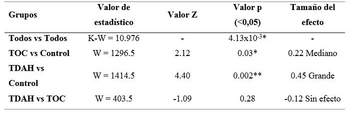 La comparación general intergrupos a través de la prueba de Kruskall-Wallis (K-W), demuestra que hay diferencias significativas (K-W = 10.98, dƒ = 2; p = 4.13x10-3). Para especificar las diferencias, se realizan contrastes en análisis pareados por medio del Test de Suma de Rangos de Wilcoxon (W), como se observa en la Tabla 2, donde se identifica que existen diferencias entre el grupo control, y ambos grupos clínicos (TOC p = 0.03 y TDAH p = 0.002), pero no entre los dos grupos clínicos (TOC vs TDAH p = 0.28). Se realizó medida del tamaño del efecto para el test de Wilcoxon, identificándose que el tamaño del efecto es más grande en TDAH vs control, mediano en TOC vs control y no tiene efecto en TDAH vs TOC, pues no se identifican diferencias.