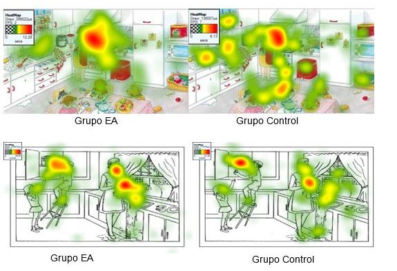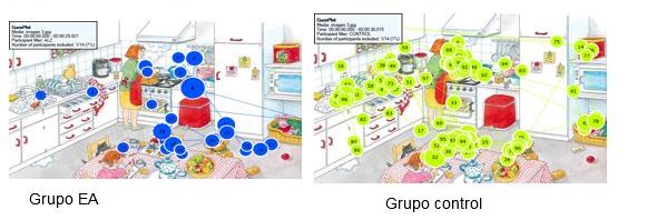 Al observar los mapas de calor de la imagen 1, se evidencia que en el evento de la cocina en general el grupo control percibe más detalles, fijando la mirada en ellos, que el grupo EA. En la lámina "el robo de las galletas" los controles fijan más claramente su atención en los agentes que en los elementos en que recae la acción, los controles miran más tiempo las manos que la cara del personaje principal, es decir dan más importancia a la acción (verbo) que al sujeto (nombre).