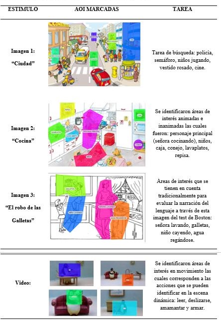 Fuente: elaboración propia.El presente estudio analizo las características de la percepción de eventos estáticos y dinámicos en personas con EA, y la relación entre la percepción de eventos (como las personas procesan las escenas) y la producción del lenguaje, encontrando diferencias significativas en cuanto a los parámetros de búsqueda, identificación de elementos en el rastreo visual y en la producción lingüística a partir de un evento observado.