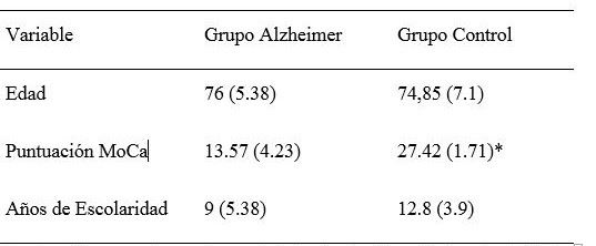 En el presente estudio se evaluaron catorce adultos mayores, siete diagnosticados por consenso con enfermedad de Alzheimer probable leve o moderada (cinco mujeres, dos hombres), convocados a partir de la base de datos del Instituto de Genética de la Universidad Nacional de Colombia con la colaboración del Grupo de Investigación en Neurociencias y siete controles, adultos mayores sanos convocados del grupo “Mentes en Acción” del Centro de la Comunicación Humana de la Facultad de Medicina de la Universidad Nacional de Colombia.