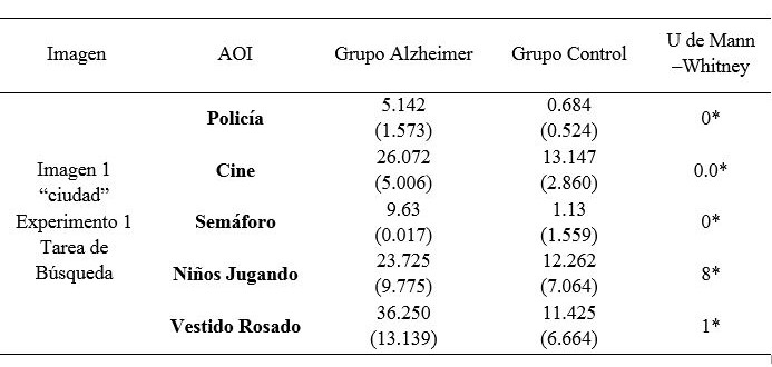 En la tarea de búsqueda para efectos de esta investigación se utilizaron ordenes simples y palabras conocidas, el objetivo correspondía a un elemento visualmente relevante en la imagen y de función única lo que significa que no había objetos distractores de similares características, lo anterior facilita el rendimiento de las personas con Enfermedad de Alzheimer, sin embargo tal como se ilustra en la Tabla 2, el grupo control encontró con más rapidez el objeto que debía identificar dentro de la imagen; al respecto Foster, Behrmann, and Stuss (1999) así como Tales y colaboradores (2002), reportan resultados similares en los cuales las personas con enfermedad de Alzheimer logran realizar tareas de búsqueda única con una latencia aumentada, otras investigaciones reportan que en búsqueda única el tiempo de reacción es generalmente más lento comparado con personas que no manifiestan esta patología (Hao et al., 2005; Landy et al., 2015; Tales et al., 2002).