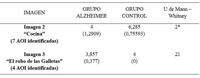 En la tabla 4 se presentan los resultados del rastreo visual de las Imágenes 2 y 3, en las cuales disponían de 30 segundos para realizar una exploración libre, se evidencia diferencia significativa en la imagen 2 “cocina” en la cual el grupo EA identifico menos elementos (de los 7 marcados) que sus controles, en contraste con la imagen 3 “el robo de las galletas” en la cual no existe diferencia significativa en cuanto al número de elementos percibidos entre los dos grupos.