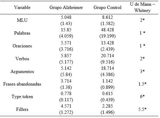 En la tabla 2 se describen las características sociodemográficas de la muestra. No se encontraron diferencias significativas en las variables edad y los años de escolaridad, en el MLU existe diferencia significativa indicando deterioro de las funciones cognitivas en el grupo con EA.