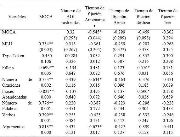 Para observar las posibles relaciones entre las tareas de tipo visual y el análisis de la producción lingüística, se planteó una correlación de Spearman en la que se observa una correlación significativa en las puntuaciones del MOCA frente al MLU, los Fillers, el número de oraciones, las frases abandonadas, el número de palabras, los verbos y los argumentos (Tabla 6).