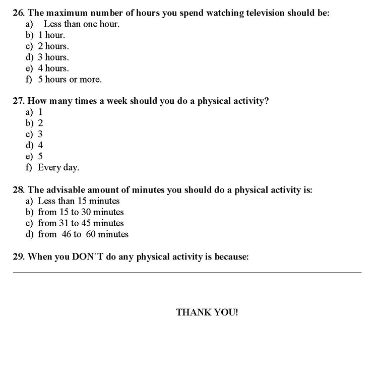 The “Stage of Change in Behavior of Scholars in Eating habits and Physical Activity” (CEHAF) is a self-administered questionnaire. It consists of 35 questions, including 18 multiple choices, on habits and attitudes towards alimentation and PA. For the purposes of this project, breakfast contents and food eaten as snacks were considered the main habits to change, since breakfast is the meal skipped more often (Prochaska, 2008). PA was defined as any movement of the musculoskeletal system to increase energy expenditure by individual activities, recreational or sports, considering as an indicator the number of minutes per week allocated to any of these practices (Johnson et al., 2008). Individuals were classified as sedentary if they do not perform any type of recreational PA, exercise or sport, during their free time and/or assign more than 2 hours a day for watching television, using the computer, or playing video games.