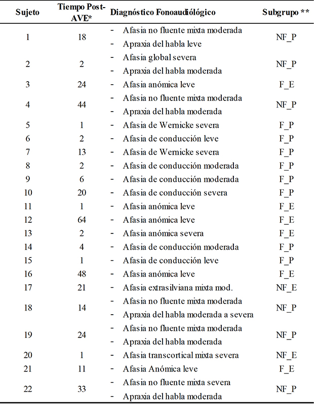 El grupo de estudio estuvo conformado por un total de 22 sujetos afásicos, 12 hombres (54.5 %) y 10 mujeres (45.5 %), con un rango de edad entre 43 y 78 años y una media de edad de 58.1 años (10.1). Con respecto al tipo de afasia, 14 sujetos eran portadores de una afasia fluente (8 sujetos con lesión perisilviana y 6 con lesión extrasilviana) y 8 sujetos eran portadores de una afasia no fluente (6 sujetos con lesión perisilviana y 2 con lesión extrasilviana). Con respecto a la distinción de lesiones perisilvianas y extrasilvianas, es importante precisar que esta surge a partir de la topografía de la lesión y la conservación de la capacidad de repetición. Las afasias con lesiones extrasilvianas, también conocidas como transcorticales, se producen por daños predominantemente situados fuera de la zona del lenguaje o área perisilviana y presentan conservación en la capacidad de repetición. Por su parte, las afasias con lesiones perisilvianas se producen por lesiones en la zona perisilviana y presentan un importante déficit en la capacidad de repetición (Ardila, 2006). Los participantes eran pacientes de diversos centros de atención del servicio público de salud de la provincia de Concepción (Chile), todos los cuales contaban con el diagnóstico de afasia, establecido a través de la aplicación del Protocolo de Evaluación del Lenguaje para Pacientes Afásicos (González, 2001) e informado por fonoaudiólogo tratante, según se constató en la ficha clínica (Tabla 1).