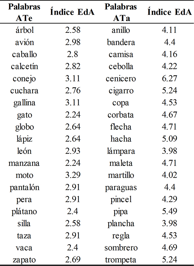Antes de iniciar la tarea de denominación, se hizo lectura de las instrucciones en forma lenta y clara, de manera tal de que cada sujeto tuviese absoluta claridad de la modalidad de respuesta que debía entregar. Estas instrucciones pusieron énfasis en los siguientes aspectos: modalidad de respuesta (oral), uso de una intensidad de voz apropiada y plazo de tiempo para producir la respuesta. Las instrucciones brindadas fueron las siguientes: “Ud. verá una serie de imágenes en la pantalla del computador. Ante cada imagen Ud. deberá decir el nombre de esta lo más rápido posible. Recuerde hablar alto y cerca del micrófono. Solo puede decir el nombre mientras la imagen está presente. Cuando la imagen desaparezca, concentre su atención en la próxima imagen”. Cada sujeto afásico respondió a una tarea de denominación por confrontación visual de 40 imágenes representativas de 20 palabras de adquisición temprana y 20 palabras de adquisición tardía. Las 40 palabras fueron seleccionadas según índice de EdA luego de aplicar una encuesta a 45 informantes, fonoaudiólogos y estudiantes de fonoaudiología, todos con conocimientos vinculados con adquisición de palabras y desarrollo del lenguaje. La encuesta consistió en solicitar a cada informante que estableciera un índice de edad de adquisición para cada una de las 140 palabras escritas presentadas, según las siguiente escala: 1 = “La palabra fue aprendida por Ud. entre el primer y el segundo año de vida”, 2 = “La palabra fue aprendida después de cumplir los 2 años de edad”, 3 = “La palabra fue aprendida después de los tres años de edad” y así sucesivamente (tanto el listado de palabras como el formato de encuesta fue tomado de Cuetos et al., 1999). Estas palabras además fueron seleccionadas controlando las covariables de frecuencia léxica (FL) y longitud de palabra con base en el número de sílabas (LPNS). Los índices de frecuencia léxica fueron obtenidos del Diccionario de frecuencias de las unidades lingüísticas del castellano (Alameda & Cuetos, 1995). Se comprobó a través de un test U de Mann-Whitney que no hubiera diferencias significativas entre ambos listados con respecto a FL y LPNS (p = 0.8816 y p = 0.1686, respectivamente). Con todo, se seleccionó un listado de palabras de adquisición temprana con un rango de índice de adquisición entre los 2.24 y 3.29 años de edad y un listado de palabras de adquisición tardía con un rango de índice de adquisición entre los 3.98 y 6.27 años de edad. No fue posible la selección de palabras con un índice mayor de edad de adquisición, para no afectar significativamente el índice de frecuencia léxica de las mismas y así evitar diferencias significativas entre ambos listados, entendiendo que las palabras que presentan un índice de edad de adquisición tardía muy alto disminuirían considerablemente el índice de frecuencia léxica de este grupo de palabras (Tabla 2).