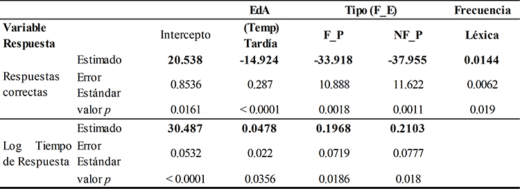 Ninguno de los modelos incorporó términos de interacción entre las variables de efecto fijo (EdA y tipo de afasia). De lo anterior se desprende que, tanto en el modelo de análisis de la precisión de respuesta como en el de análisis de los tiempos de respuesta, no se observó existencia de efectos generados a partir de una interacción entre la EdA y el tipo de afasia. Por tanto, el efecto de EdA estuvo presente independientemente del tipo de afasia y, a su vez, las diferencias entre las afasias fluentes extrasilvianas con las afasias fluentes perisilvianas y no fluentes perisilvianas se dieron tanto ante las imágenes ATe como ante las imágenes ATa. En ambos modelos se reflejó que tanto la edad de adquisición de la palabra como el tipo de afasia presentaron efectos estadísticamente significativos. Por su parte, de las covariables consideradas solo la frecuencia léxica fue estadísticamente significativa en el modelo de respuesta binaria (Tabla 3).